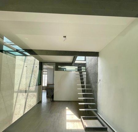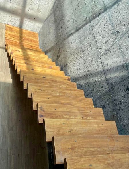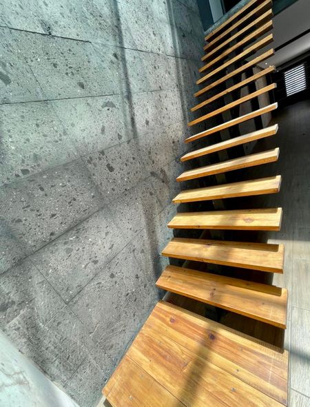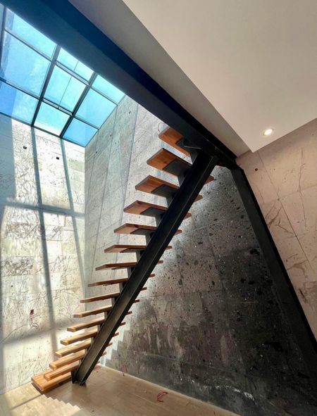 Escalera volada interior para acceso a roof garden, mismo que cuenta con piso y un medio baño.