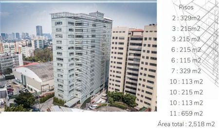 OFICINAS MUY ILUMINADAS, TENEMOS TAMAÑOS: 113, 115, 215, 329 Y 659 MTS. CUENTAN CON ESTACIONAMIENTO DISPONIBLE, ELEVADORES, BAÑOS POR NIVEL, SERVICIOS DE LUZ, AGUA, HIDRANTES, EXTINTORES, SEGURIDAD 24HRS.