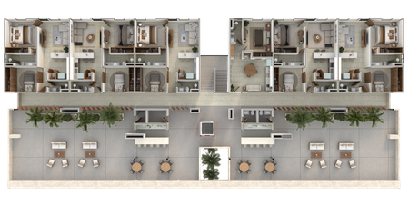 Consta de 2 torres de 4 niveles con 42 departamentos de 1 y 2 habitaciones.
