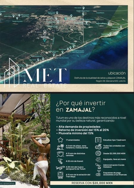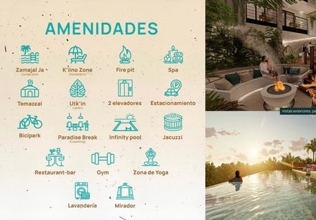 Apartamentos en venta en Tulum. ZAMAJAL TULUM es un desarrollo inmobiliario con 71 Estudios, 8 departamentos 2 habitaciones lock-off y 1 departamento de 3 habitaciones lock-off en venta. Zamajal Tulum cuenta con amenidades como: Alberca de Selva, Alberca Infinita, Jacuzzi, Asoleadero, Bar, Restaurante, Gimnasio Zona de Yoga, Mirador, Spa, Temazcal, Centro de Negocios, Jardin, Fogatero, Lavanderia, 2 Elevadores, Estacionamiento, Bicipark y seguridad 24/7