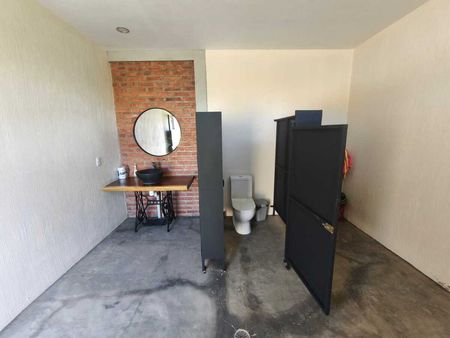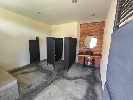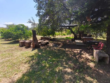 Cuenta con árboles frutales y un área parcialmente construida que incluye baños para damas y caballeros.