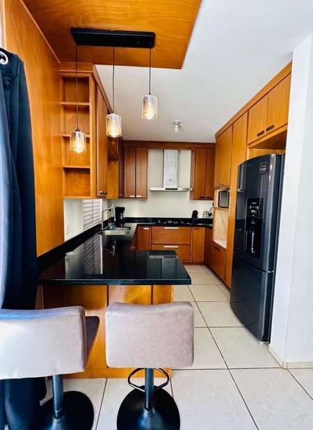 * Cocina Equipada de Madera y Cubierta de granito con placa, Campana, Horno Microondas, Refrigerador, Barra con dos Bancos