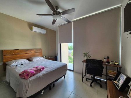 1 recámara con cama matrimonial, buro, cabecera, TV con mueble, cortinas black out, aire acondicionado y abanico.