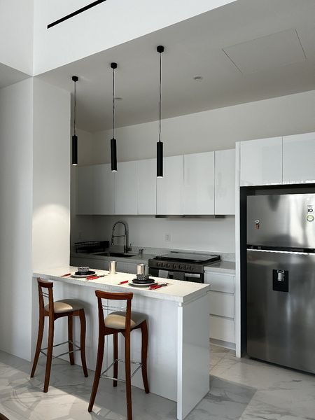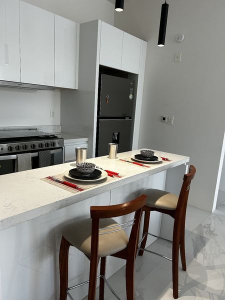 Cocina: Cocina equipada con electrodomésticos, utensilios y barra de desayuno.