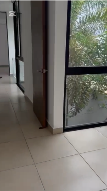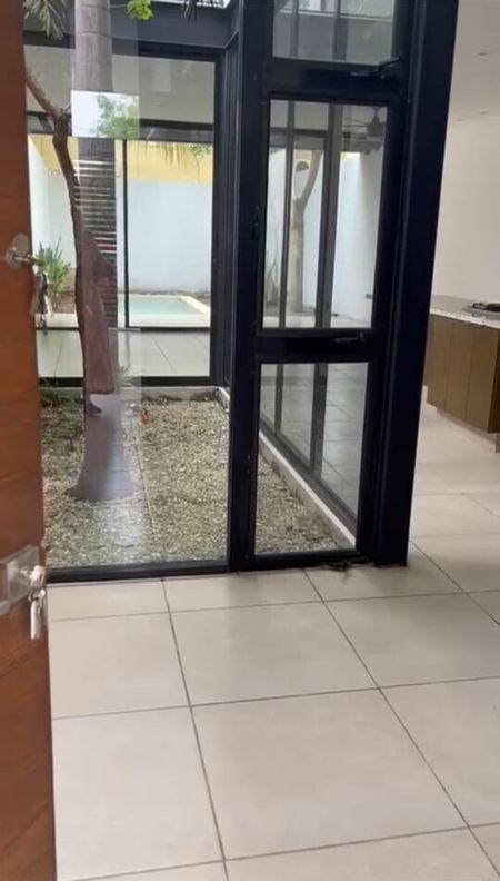 * Jardín interior con palma, grava e iluminación, puertas corredizas y ventanas que permiten el paso del aire a toda la planta baja