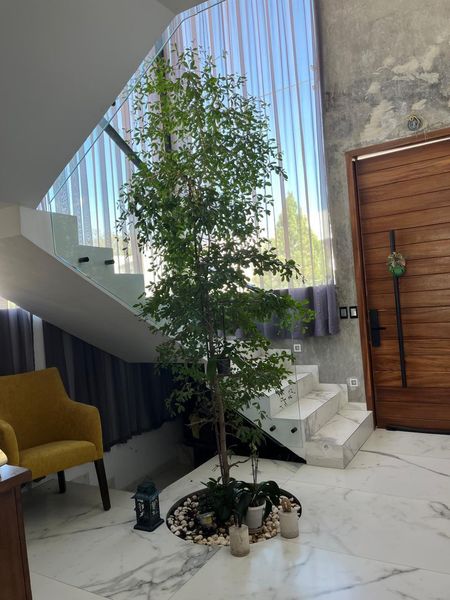 Recibidor amplio con un hermoso olivo negro muy frondoso.