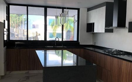 Amplia cocina con barra de 2.50m para 5 posiciones, con electrodomésticos como horno a gas y microondas con función de horneado.