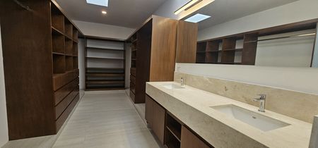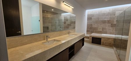 - Recámara principal con walk-in closet con isla, baño con doble lavabo, regadera y tina.