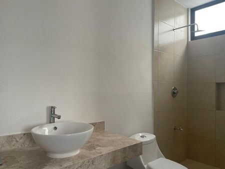 Acabado Exterior tipo Chukum, detalle de piedra rústica, interiores en yeso, piso cerámico de 60 x 60, biodigestor, tinaco,