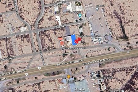 Ubicado sobre la lateral de Blvd. Fundadores, a la altura de Hielo Cristal, cuenta con 495m2 de superficie, 15m de frente, 33m de fondo, barda perimetral, portón y cimentación para maquinaria pesada y trailer. Frente sobre calle ancha.
