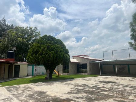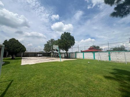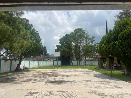 Media cancha de basquetbol, estacionamiento amplio con sombra.