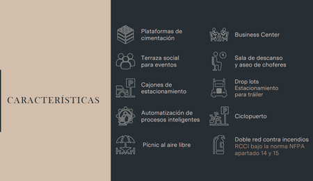 Los Terrenos se entregan con una cimentación de 60 cm y el Parque con seguridad de 24H, Barda perimetral, malla electrificada, Portón en Caseta, Servicios conectados (Agua, electricidad e Internet) se entregan también con un Transformador de 45KVA cada lote.