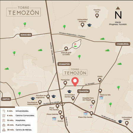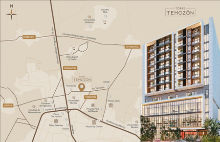 Torre Temozón se encuentra en una de las zonas más exclusivas de Mérida, a solo minutos de universidades, hospitales, centros comerciales y vialidades principales como Periférico Norte y Carretera Progreso.