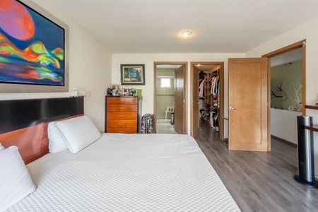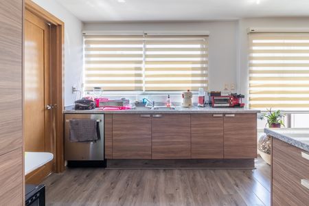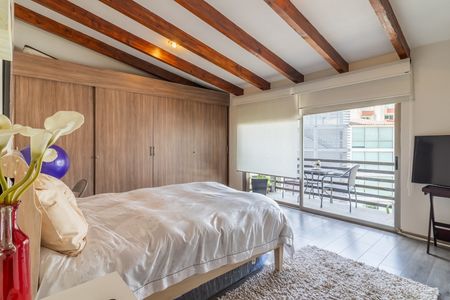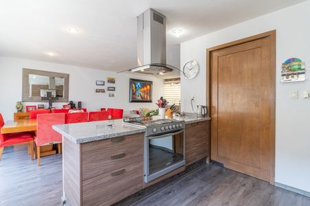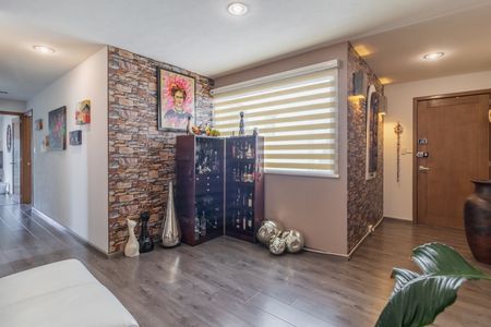 El departamento consta de amplia estancia de sala y comedor, cocina integral abierta con barra para desayunar, cuarto de servicio con baño completo, al fondo tres amplias recámaras con techos altos, una con clóset, la segunda con clóset y balcón, la principal con baño completo y vestidor y otro baño completo en el pasillo que da servicio a la estancia y a las dos recámaras secundarias.