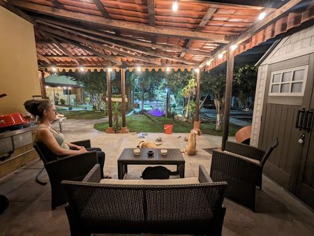 La casa tiene una hermosa terraza con tejado alrededor de todo el frente de la casa.