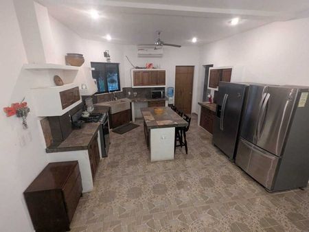 Cocina vestida con gabinetes, estufa de 6 quemadores con horno y microondas, tanque de gas y refrigerador.