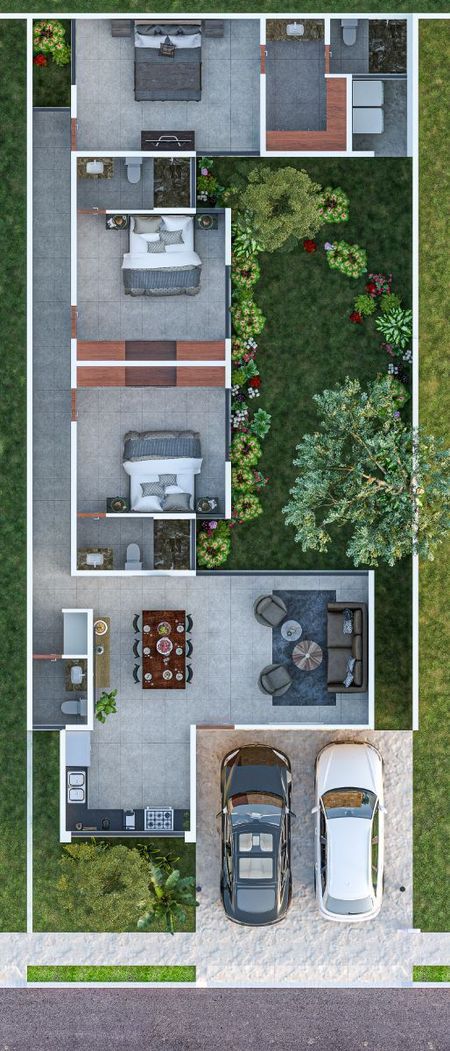 Una sola planta en el que el proyecto gira alrededor de un patio que articula todos los espacios y en el que la naturaleza estará presente en todas las visuales. Es ideal para quien busca algo diferente y cómodo sin la necesidad de subir escaleras.