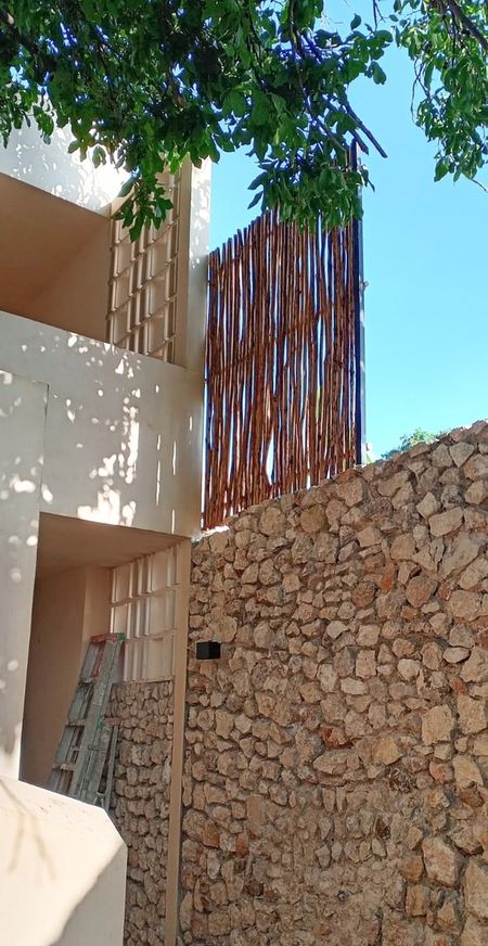 Fachada con piedra natural y acabado Chukum Kimiplaster KP-60