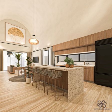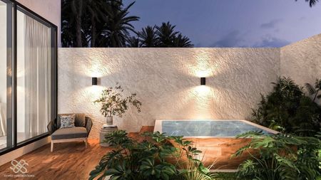 Esta residencia se diferencia de las demás por un diseño arquitectónico contemporáneo con toques mediterráneos se distingue por su estilo Wabi Sabi con dobles alturas , pronunciadas curvas ,acabados en chukum , piedra natural y amplias jardineras que dan vida . un estilo único a la fachada e interiores. , además de ser un Smart Home controlada desde la app de tu teléfono.