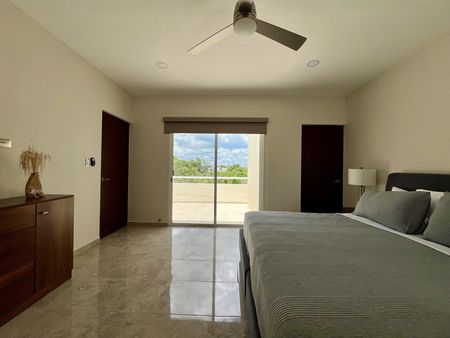Recámara principal con amplio balcón, amplio closet vestidor equipado y doble lavabo