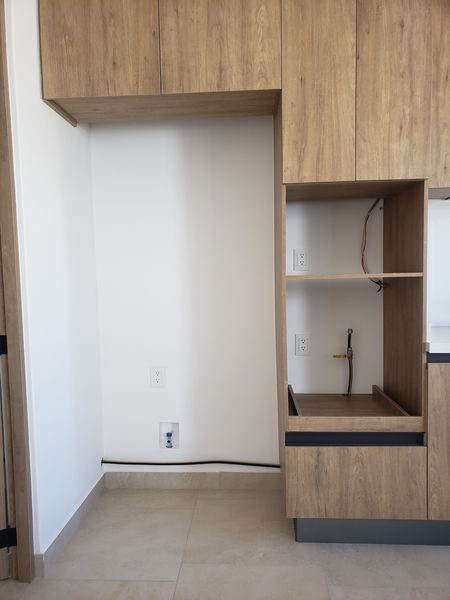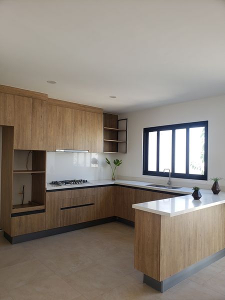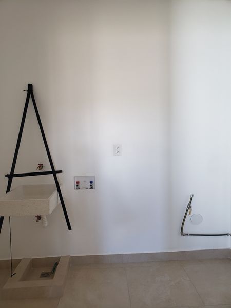 Estacionamiento para 2 autos, cisterna, cocina equipada, área de lavado y jardín.