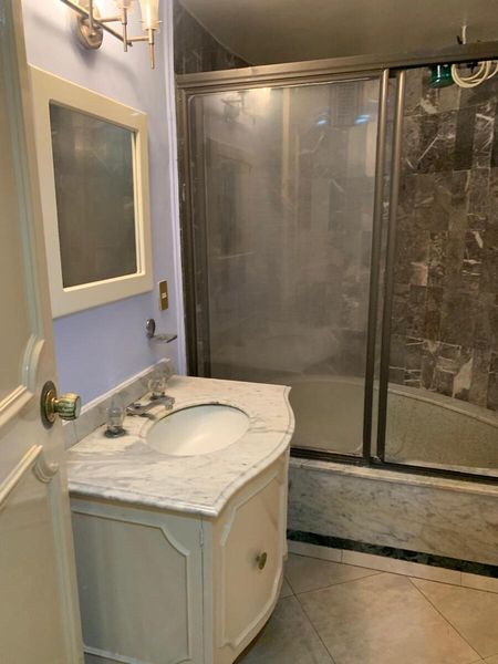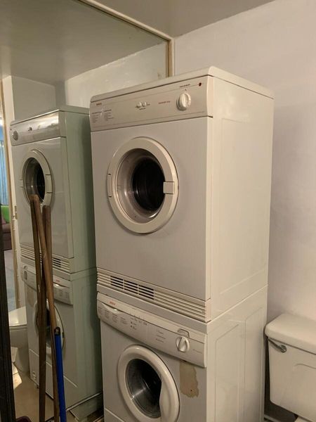 - Un baño completo con tina romana, lavamanos y un mueble para blancos, WC y una lavadora y secadora