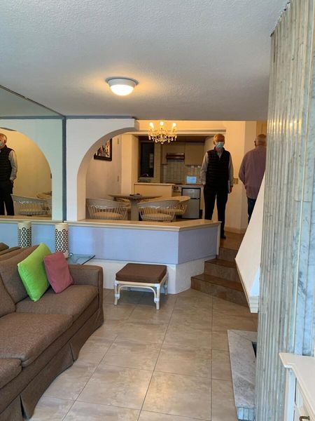 - En un desnivel una estancia con sofá grande, un sillón, un taburete, librero empotrado y chimenea.