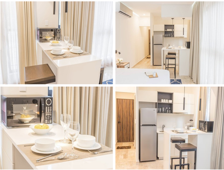 • Cocineta (Estufa, microondas, refrigerador, batería de cocina).