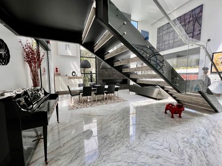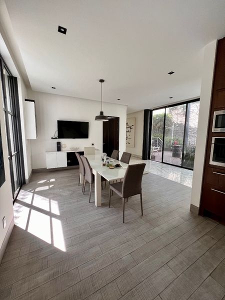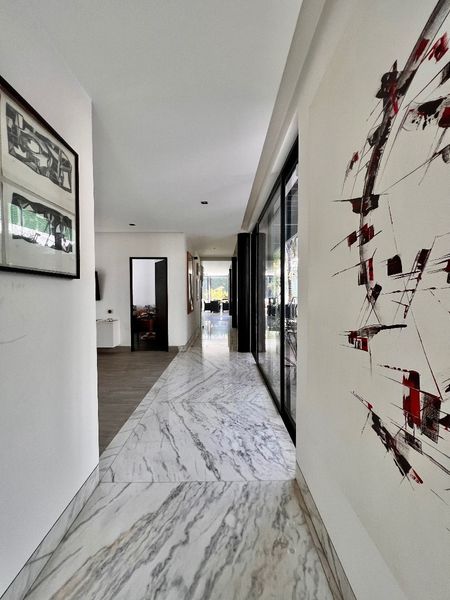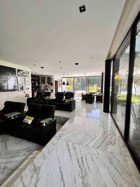 La residencia es un lugar ambientado, con mucha luz que desde la entrada te invita a estar, con una sala a doble altura y chimenea, baño de visitas y un pasillo que te lleva hacia la amplia cocina abierta y equipada con isla central y desayunador, cuarto de servicio amplio, despacho, salón de juegos, con una sala de cine con asientos eléctricos , bar ,baños de hombres y mujeres.
