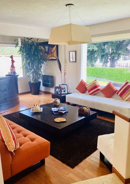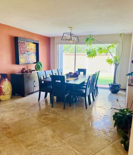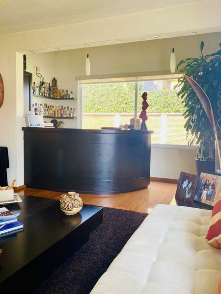 comedor, la sala con un acogedor bar, por la entrada principal encontramos una oficina, medio baño de visitas y clóset.