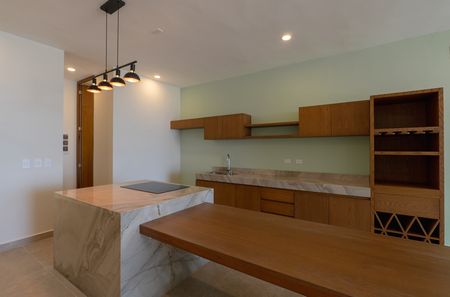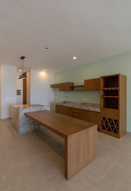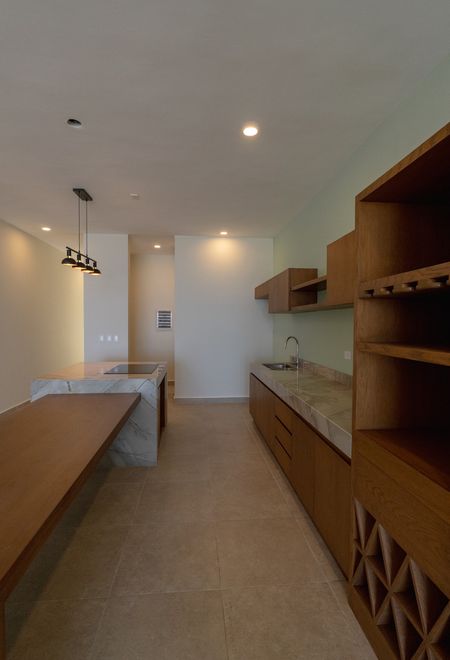 • Carpintería en cocina inferior y superior elaborada con marcos de cedro, cuerpo de listón de encino,