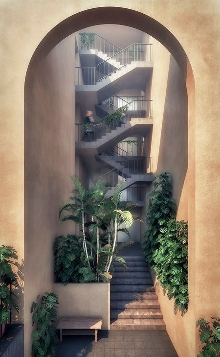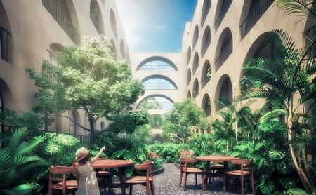 Yaxche consta de dos volúmenes que se complementan entre lo habitacional y lo comercial, conectados entre sí por un puente y separados por un patio central con excelentes áreas verdes.