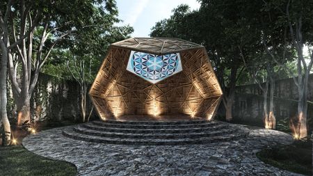 Parque Éter: centro de meditación éter, explanada, área verde central, estacionamiento.