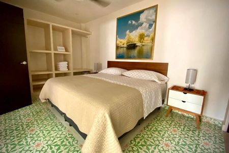• Cama King Size con cabecera de Dzalam y Burós de madera con diseño retro.