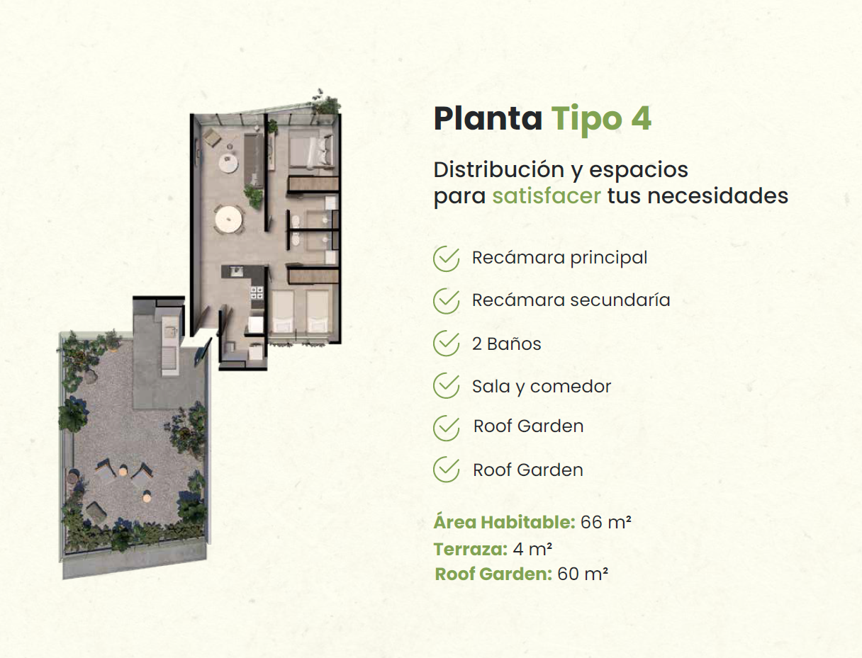 ✨ 66 m² habitables + 3.5 m² de terraza + 60 m² de Roof Garden privado