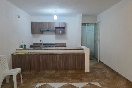 Terraza techada y cerrada con material herrería, madera y aluminio. Cocina equipada con estufa con 4 quemadores y horno